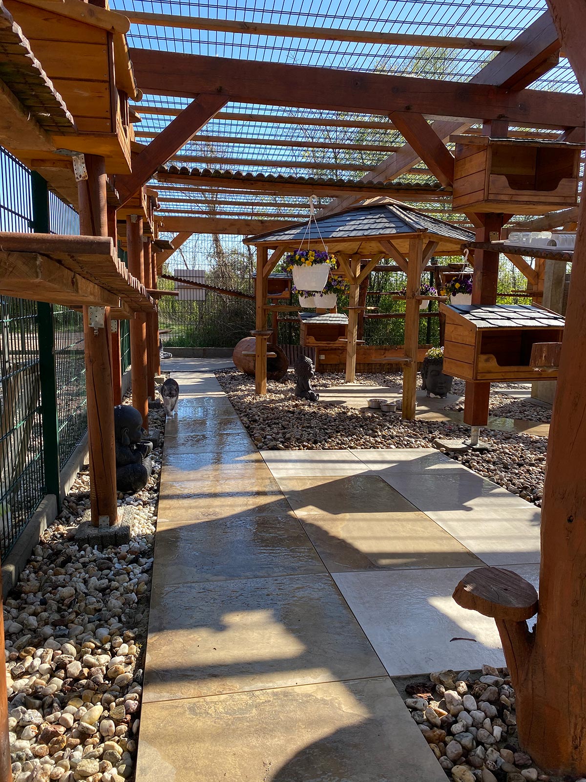 Alle Zimmer sind durch Katzenklappen mit dem 200 qm großen Freigehege verbunden, welches viel Platz für einen entspannten Urlaub unserer Samtpfotengäste garantiert.